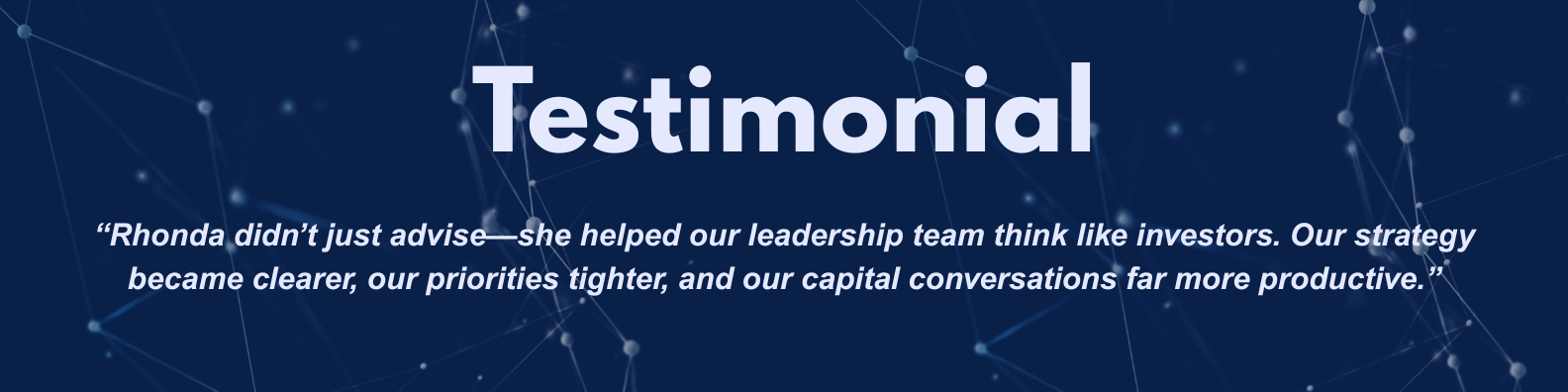 Partnering with Rhonda Klch at the board or advisory level is most valuable when an organization is at a critical inflection point. Her approach combines governance, capital strategy, and operational execution. Rhonda brings board-level thinking rooted in investor logic, helping leadership teams align priorities with valuation, risk management, and scalable growth.